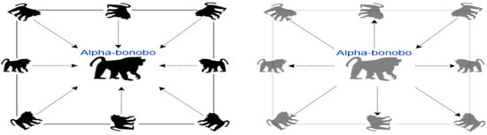 Bonobo Optimizer (BO) is a new metaheuristic algorithm which is influenced by the reproductive approach and social conduct of Bonobos. It is a population-based algorithm developed by Amit Kumar Das et al. [40]. The algorithm adopts the fission-fusion search approach of Bonobos for proficient optimization. Bonobos partition into smaller groups, which are referred to as fission, for locating foods and later are reunited (fusion) at night for sleeping (refer to Figure 3). This distinct method was utilized in the algorithm to make the searching process more effective. Similarly to other heuristics, BO is also an algorithm based on population. An individual solution in the population is named a bonobo. The most dominant bonobo with the best rank hierarchy is called the alpha bonobo (αbonobo). Additionally, Bonobos advance through phase probability, which is either population diversity or selection pressure and through positive (PP) and negative (NP) phases, as shown in Figure 4. The counts of a successive number of iterations of PP and NP are called positive phase counts (ppc) and negative phase counts (npc), respectively. In order to reach the global optimum solution, the algorithm explores the natural behaviours and strategies of Bonobos. Bonobo utilizes four different mating strategies to create new Bonobos, they are: promiscuous, restrictive, consortship and extra-group mating [40].