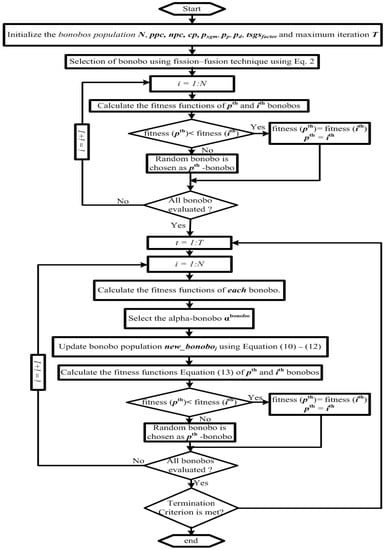 The mating strategies will change depending on the phase condition (positive (PP) or negative (NP)). The PP physically depicts the bonobo community when there is sufficient food, protection from neighboring communities, mating success and genetic variety among bonobos. The likelihood of the first two kinds of mating, i.e., promiscuous and restricted mating, will be greater during this period. Promiscuous mating makes an oestrus female available to both the alpha bonobo (i.e., the highest-ranking male in a group) and other lower-ranking males. However, in the event of restricted mating, only males of higher status may join. The NP, which denotes an unpleasant condition in the society, increases the likelihood of consortship mating and extra-group mating. A couple is isolated from their original community and spends their time together in a kind of mating called consortship. They rejoin their community after a few days or weeks. However, in the instance of extra-group mating, a female bonobo is observed mating with males from different communities. Additionally, the likelihood of extra-group mating is quite low in comparison to the possibility of mating with another group. These physical events are artificially reproduced in the suggested BO by the use of mathematics for optimization. The flowchart of the proposed algorithm is shown in Figure 5.