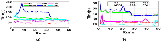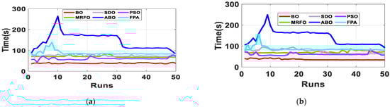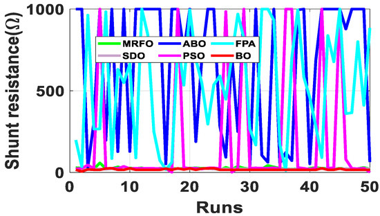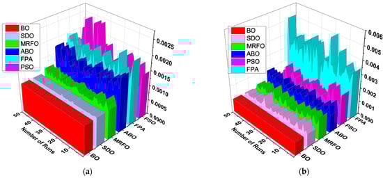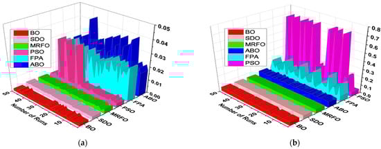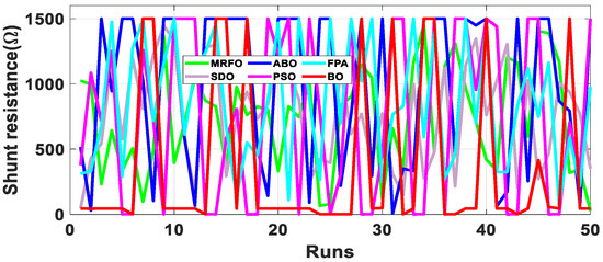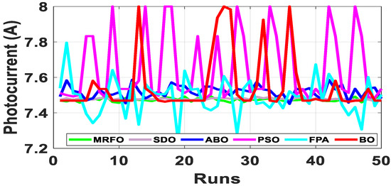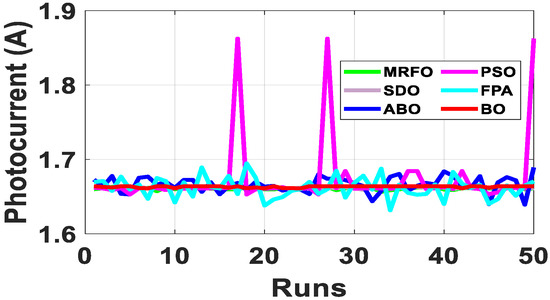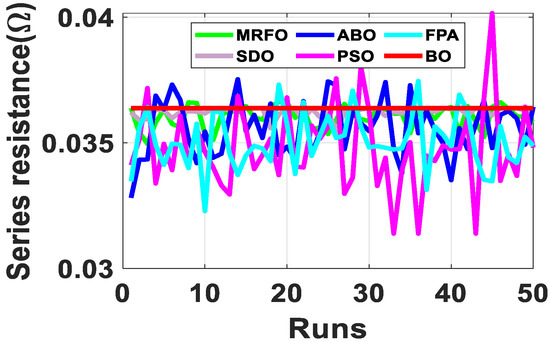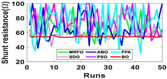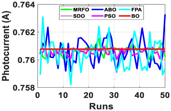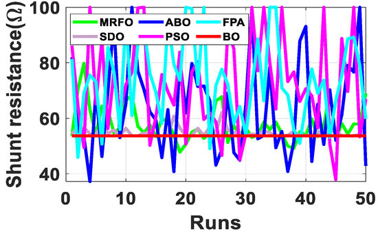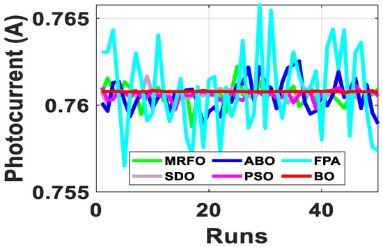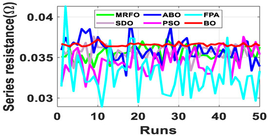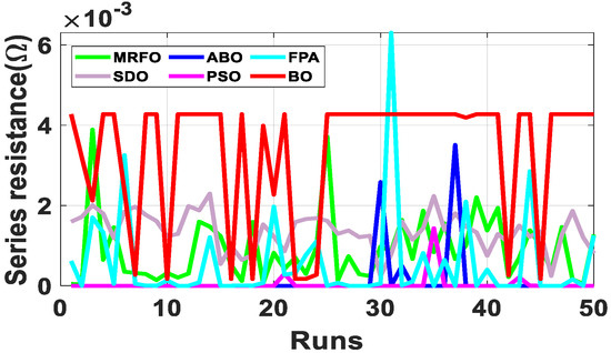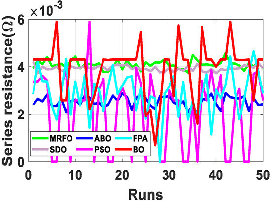 Since the accurate parameters are yet to be established, a meaningful way of establishing extracted parameters is the comparison of their fitness function (FF). As described in Equation (10), RMSE is adopted to evaluate the fitness function. Out of the 50 runs, the run with the minimum fitness function for each algorithm is selected. Figure 6 shows the fitness function with respect to the number of runs for the R.T.C. France SDM and DDM solar cell at 33 °C. From Table 2, BO exhibits the lowest standard deviation, minimum FF, and lowest maximum FF for both the SDM and DDM model. It is evident from the results that BO achieved optimum parameter extraction with minimal oscillations as compared to MRFO, ABO, PSO, FPA and SDO.