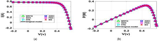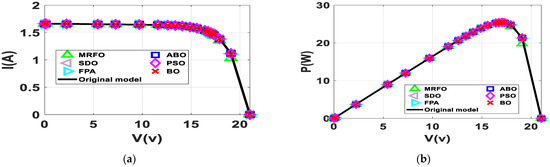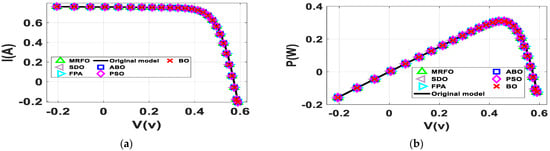BO, MRFO, ABO, PSO, FPA and SDO are utilized in determining parameters of the SDM and DDM. The parameters of models are obtained using the objection function in Equation (10). A notable standard solar data cell, R.T.C. France solar cell at 33 °C, which is extensively reported in the literature is selected as the benchmark for comparing and testing the algorithms [45]. The performance of the algorithms is further evaluated from the practical I-V curve of the single diode model of STM6-40 with 36 series cells at 51 °C and the single diode model of STP6-120 with 36 series cells at 55 °C. These datasets are obtained from [6,46]. To achieve a rational comparison, the three algorithms are compared under the same parameters as shown in Table 1, 500 iterations, 100 population size through 50 independent runs. The search ranges are determined based on boundaries conditions reported in [6]. The simulations were implemented on an Intel Core i5-8250U CPU@1.80 GHz, 16 GB under Window 1064bit with MATLAB 2020b.