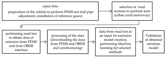 Due to the fact that full hybrid vehicles and their emission specifications are different compared to conventional combustion engine vehicles [20] in this work, the authors propose a methodology for the creation of a new emission model for this type of vehicle. Full hybrid vehicle within a specific range of engine operation when, in fact, the combustion engine is not working, but the electric engine powers the vehicle and emits zero emissions. For vehicle operation, especially when the vehicle speed is high, there can be a state in which electric and combustion engines work at the same time, or the combustion engines work separately. In general, the level of emission of harmful exhaust components for NOx, PM, THC, and CO is relatively low compared to the previous generation internal combustion engines due to the configuration and catalytic system of the latest engine system. However, due to the consumption of hydrocarbon fuel, there are still CO2 emissions that affect global warming. Based on the literature review, there is no work that focuses on modeling CO2 emissions for full hybrid vehicles on a microscale. Furthermore, actual existing emission models for micro-scale, especially when emission map is taken under consideration, wrongly indicate emission hotspots, since for some range of vehicle speed, which occurs especially in the urban cycle of vehicle operation, there is actually no emission when the electric engine is working. Given the above, this work concerns the presentation of the methodology for the CO2 development emission model for a full hybrid vehicle. The creation of an emission model is based on the review of the accuracy results of methods, such as linear, robust regression, fine, medium, coarse tree, linear, cubic support vector machine (SVM), bagged trees, Gaussian process regression (GPR), and neural network (NNET). Particularly in the work, the best fit for the road input data for the CO2 emission model creation was the GPR method. The obtained emission model is a microscale model, so that means that it can be useful, e.g., in the case of a detailed analysis of emissions on a particular part of the road. The overall flow chart of the research is presented in Figure 1.