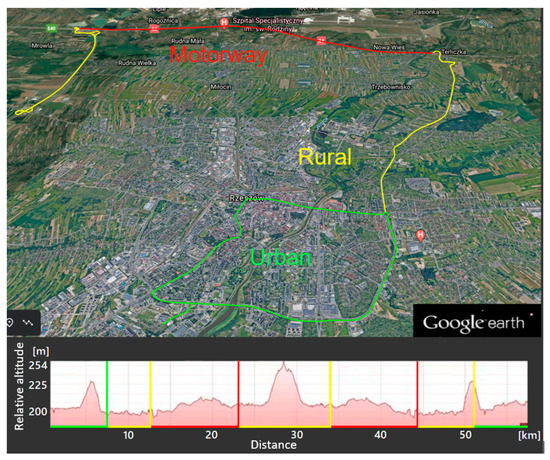 For contemporary models of exhaust emissions, it is also necessary to distinguish between them due to the specificity of traffic during road tests. Microscale models are most often divided according to the type of road into urban, rural, and motorway. This division is important because if we also list the data obtained while driving through the indicated parts of the road, the created exhaust emission models will be more accurate. The test route for tests using the PEMS system is shown in Figure 3.