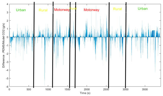 The differences in emissions obtained from road tests (PEMS) and model calculations are shown in Figure 11. Based on Figure 10 and Figure 11 we can see that relatively some differences in the emission obtained have been observed, both from the PEMS and the computational model. The largest single gap can be visible for the rural road section—around −6 g/s. Some gaps have also been observed in the rest of the road sections, urban and motorways, up to 3–−3 g/s. The highest density of differences can be noted for the urban section, as mentioned before—period 3700–3800s.
