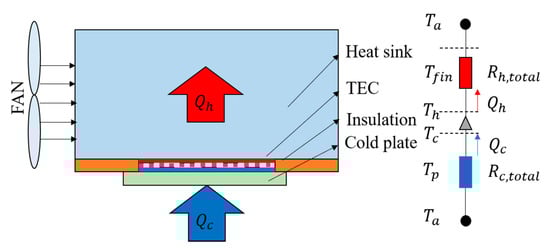 The TEC module works between the cold plate and the heat sink. The heat transfer model of a typical thermoelectric system can be discussed using the thermal resistance network model shown in Figure 1. The thermal resistance on both sides is simplified in the thermal resistance network diagram, which only includes the total hot side thermal resistance () and cold side thermal resistance (). The thermoelectric cooling module is modeled by the one-dimensional steady-state method used in most previous literature. The total thermal resistance of a thermoelectric refrigeration device is the ratio of the heating capacity of the device to the temperature difference of its corresponding ambient temperature.