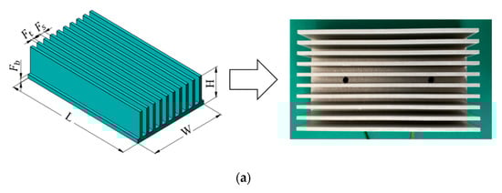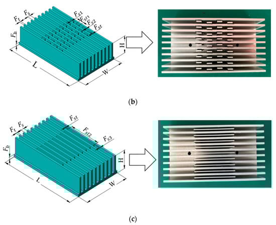 The finned heat sink is built of a thermally conductive aluminium alloy, and its overall size is 100 mm () × 60 mm () × 23 mm (). At the same time, on the premise that the overall appearance size of the heat sink fin does not change, to increase the heat sink’s heat dissipation capacity, a sub-channel between the heat sink fin is added, that is, a new fin between the two fins (as shown in Figure 2b,c). The finned heat sink is manufactured by Beijing Terris Technology Co., Ltd. in China by wire-electrode cutting. Its goal is to increase the heat sink’s heat dissipation performance by extending the finned heat sink’s heat dissipation area and modifying the air-flow pattern.