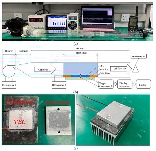 The experimental figure. (a) The physical structure of the experiment, (b) the schematic structure of the test, (c) physical picture of thermoelectric refrigeration module.