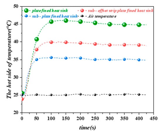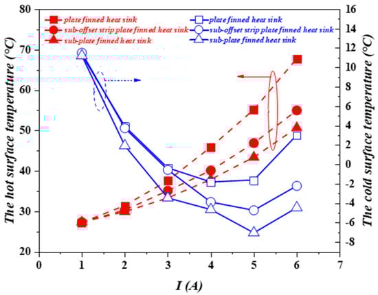 The temperature of the hot and cold surfaces of the TEC module changes with input current, as shown in Figure 5a. The following can be seen in the diagram, the hot surface temperature of the TEC module rises as the input current is increased. When the input current , the temperature of the hot surface is basically the same, due to the fact that all three types of heat sink effectively diffuse heat into the air. As the input current increases, the TEC module generates more heat, and the advantages and disadvantages of the three heat sinks are highlighted, which can be seen from the thermal surface diagram. When the current , the thermal surface temperature of the TEC module is reduced by about and , respectively, when the sub-offset strip plate finned heat sink and the sub-plate finned heat sink are compared to the plate finned heat sink.