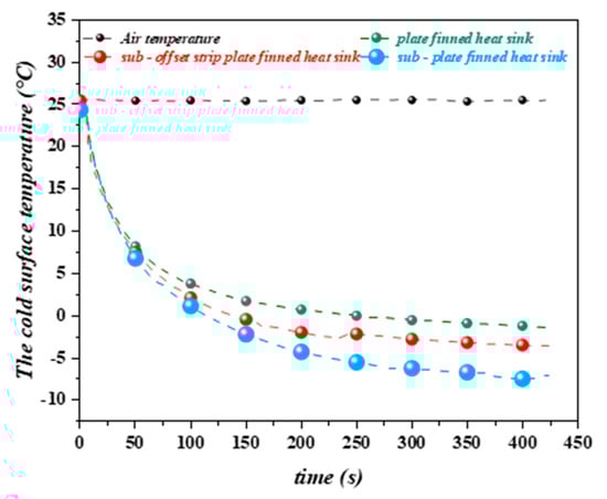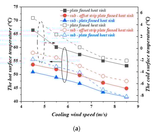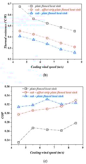 In this study, the influence of the cooling wind speed of the heat sink on the performance of the TEC module was also evaluated in detail. Under varying cooling wind speeds, the experimental findings of the TEC module’s hot and cold surface temperatures, total thermal resistance, and total COP are seen in Figure 6. The experimental results clearly show that increasing the TEC device’s cooling wind speed decreased the TEC module’s hot and cold surface temperatures, decreased the total thermal resistance, and enhanced the COP. In addition, we can obviously see from Figure 6a that the new heat sink still maintains superior thermal performance under different wind speeds. When the cooling wind speed is , the average cold surface temperature of the TEC device of sub-offset strip plate finned heat sink and sub-plate finned heat sink is reduced by 3.18 °C and 4.3 °C respectively, compared with the plate finned heat sink. When the cooling wind speed reaches , a thermoelectric refrigeration unit’s average cold side temperature using a sub-plate finned heat sink may reach −8.25 °C, which is 6.35 °C lower than the temperature of a plate finned heat sink. The findings demonstrate that the novel heat sink can maintain excellent thermal performance in both low and high wind speeds.