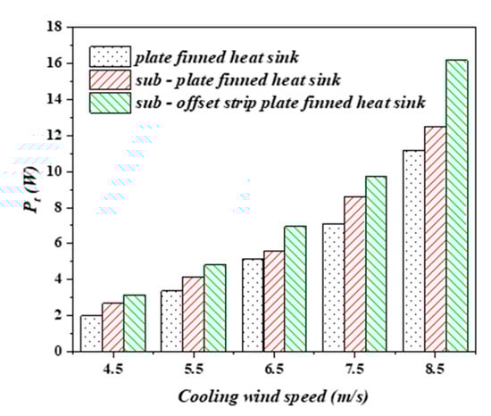 The power consumption of fans is also a very important parameter in thermoelectric refrigeration devices. The power required by the fan gradually increases as the cooling wind speed increases. The fan’s power consumption under the three heat sink types is significantly less when the cooling wind rate is meager. As the wind speed gradually increases, the power required by the fans in the thermoelectric units with sub-plate finned heat sink and sub-offset strip plate finned heat sink to achieve a cooling wind speed of is increased by and , respectively, compared to the plate finned heat sink. This is because, as the wind speed at the outlet increases, the boundary layer friction resistance of the air-fluid on the fin increases, resulting in the fan requiring greater input power to overcome the friction resistance. In fact, in order to achieve a cooling wind speed of the power consumed by the fan under the sub-offset strip plate finned heat sink unit would be of the power consumed at a cooling wind speed of Although an increase in cooling wind speed reduces the heat sink’s thermal resistance by , the COP value of thermoelectric units has remained relatively unchanged, which has been explained above. Therefore, if it is not that the temperature of the cold side must reach a certain low temperature, the cooling wind speed of the hot side should not be too high, otherwise, the power consumed by the fan will increase sharply.