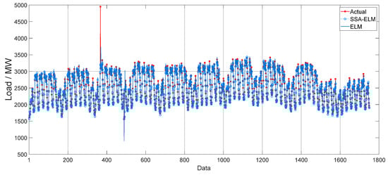 In the experimental process, we find that although ELM has the advantages of high accuracy and a fast training speed, the prediction stability is slightly poor. To further improve the prediction effect, we use the salp swarm algorithm (SAA) to optimize the number of hidden layer neurons and threshold of ELM to improve the accuracy of point prediction. After using SSA optimization, the prediction accuracy of the model has been significantly improved. It can be seen that MAPE, MAE and MSE decreased to 1.98, 50.42 and 6723.70, respectively. Figure 3 is the comparison between the prediction results of SSA-ELM and ELM. From Figure 3, we can see that SSA-ELM has a higher prediction accuracy than ELM. Therefore, we can conclude that using the SSA method to optimize the number and threshold of ELM hidden layer neurons is better than selecting only the optimal number of ELM hidden layer neurons.