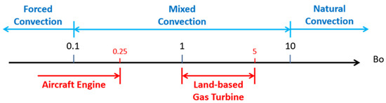 The rotating effects on internal cooling have received increased attention. The non-dimensional parameters rotation number (Ro) and buoyancy parameter (Bo), firstly proposed by Wagner et al. [8,9], are most commonly used to describe the rotating effect. The Ro describes the ratio of Coriolis to inertia. The Bo refers to the relative strength of natural convection to forced convection. Based on Bo, the convective heat transfer inside a turbine blade can fall into the regime of natural convection (Bo > 10), mixed convection (0.1 < Bo < 10), and forced convection (Bo < 0.1). From Figure 1 and Table 1 [1], the typical Ro and Bo of an aero-engine and a land-based gas turbine show that the internal cooling can be distinctly different in nature. Aero-engines operate at Bo of 0 to 0.25 and forced convection dominates. However, for land-based gas turbines, Bo is in the range of 1 to 5 which indicates that natural convection is parallel to forced convection or even more important.