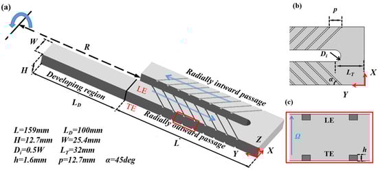 The geometry and dimensions of a rotating two-pass channel are shown in Figure 2. The two passages (AR = 2:1) are connected by a 180° sharp turn. A developing region is added before the first passage inlet to reduce entry effects. The distance between the first passage inlet and rotating axis is defined as rotation radius (R). In the first passage, mainstream is radially outward. After the turn, flow is radially inward in the second passage. In the Z direction, the upper wall and lower wall are leading edge (LE) and trailing edge (TE) with respect to rotation. In the ribbed channel, the LE and TE are roughened by 45° angled ribs, and the details of the ribs are shown in Figure 2b,c.
