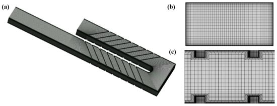 ANSYS ICEM is used to generate the fully-structured mesh, as shown in Figure 3a. The ANSYS CFX solver is used to solve the RANS equations with the SST k-ω turbulence model. By setting Ω = 1551 RPM, Ro equals 0.15. The inlet mass flow rate ( = 7.139 g/s) is given to achieve Re = 20,000, while the pressure at exit is set as 1 atm. Fixed inlet air temperature (Tin = 20 °C) and wall temperature (Tw = 60 °C) are given to maintain a constant density ratio (Δρ/ρ = 0.12). The convergence criteria are that the imbalance of momentum and energy are both less than 0.05% and the RMS of the residuals of momentum equations and energy equations is less than 1 × 10−5. To meet the requirement of the SST k-ω turbulence model, the mesh near walls and ribs is refined (Height 0.005 mm, Height ratio 1.2, Number of layer 20) as in Figure 3b,c with y+ less than 1.