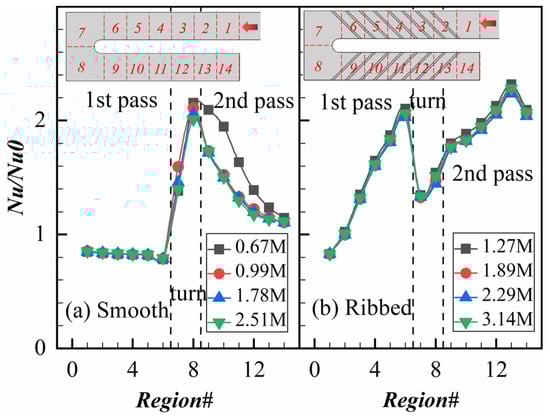 Under stationary condition, in the tip turn region of the smooth channel (Figure 12a,b), the average Nu/Nu0 is generally higher than 1.5. Moreover, the average Nu/Nu0 in the downstream location (region 8) is greater than that of the upstream location (region 7). In addition, the heat transfer contour (Figure 13a,b) reflects that the partial impingement results in a high heat transfer in the region near the tip side wall. In the tip turn region of the ribbed channel (Figure 14a,b), the Nu/Nu0 near the inner wall increases while the Nu/Nu0 near the side wall decreases, contributed to by the change of velocity profile.