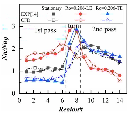 The model of the smooth channel is very similar to the test-section used by Fu [14] and the experimental results are used to verify the accuracy of the numerical simulation. The cases of Fu’s experiment (Re = 5000, Ro = 0.0 or 0.206, smooth channel) are used for comparison. The result is presented in Figure 5. In the first and second passages, the numerical results are close to experiments under both stationary and rotating conditions, with the largest difference of 16.7%. For the tip turn, the difference between prediction and experiment is a little higher. A possible reason is that the temperature distribution in the tip turn region is complicated and region-averaged temperature measured by thermocouples and copper plates has larger uncertainty.