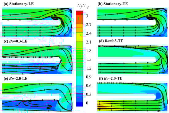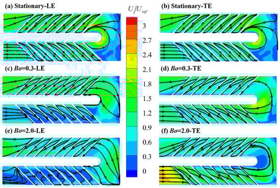 Figure 6 and Figure 7 present the 2-D non-dimensional velocity (U/Uref) contour and streamline in meridian planes at Z/H = 0.9 (near LE), and 0.1 (near TE), under stationary condition and two rotating conditions (Ro = 0.25, Bo = 0.3 and 2.0). Here, Uref refers to the average of inlet velocity. In the stationary smooth channel Figure 6a,b the flow field in the first passage is uniform. Then, the fluid is pushed to the side wall in the tip turn region. In the second passage, flow reversal exists near the upstream inner wall. In the stationary ribbed channel (Figure 7a,b), ribs-induced vortex greatly changes the flow field near LE/TE. In the first passage, the fluid near LE/TE moves along the ribs to the side wall, while in the second passage the flow direction along the ribs is opposite. In the tip turn region, the velocity near the inner wall increases while that near the side wall decreases. In addition, ribs also restrict the reversed flow near the inner wall in the second passage.