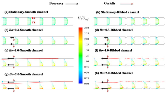 Figure 8 and Figure 9 show the 2D velocity vectors in the central plane of first (X/W = 0.5) and second (X/W = 2) passages under stationary condition and three rotation conditions (Ro = 0.15, Bo = 0.3, 1.0 and 2.0). In the first passage (radially outward flow), the Coriolis drives the air to TE and reduces the velocity near LE. Thus, when Bo = 0.3, the velocity profiles of the smooth (Figure 8c) and ribbed (Figure 8d) channels are both tilted to TE. The rotating buoyancy in the first passage is opposite to bulk flow and further reduces the air flow near LE, even inducing flow separation. When Bo = 1.0 and 2.0, an obvious flow reversal exists near LE in both smooth (Figure 8e,g) and ribbed (Figure 8f,h) channels, and separation zone expands with increased Bo. It is observed that along the mainstream direction, the separation zone does not gradually expand, but expands first and then contracts. This interesting result might be attributed to the Coriolis inversion in this region, which restrains flow separation. In the ribbed channel (Figure 8f,h), because of the higher flow instability induced by the ribs, the reversed flow is greater than that of the smooth channel, and almost all the ribs on the LE are covered by reversal flow when Bo > 1.0.