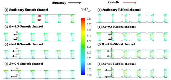 In the second passage (radially inward flow), the flow field is more complicated, influenced by the first passage, a 180° sharp turn, and ribs under stationary and rotating conditions. In the stationary smooth channel (Figure 9a), the upstream flow presents a double-peak profile with the continuous effects of the turning-induced secondary flow, and the downstream flow tends to be uniform due to the weakening of turning-induced secondary flow. In the stationary ribbed channel (Figure 9b), the upstream velocity profile is approximately uniform, while the downstream flow shows a double-peak profile due to the rib-induced secondary flow effects. In the rotating conditions, the Coriolis drives the air to the LE. The rotating buoyancy points to the rotation axis whose direction is the same as bulk flow near both LE and TE. Therefore, in the smooth channel, when Bo = 0.3/1.0 (Figure 9c,e), the double-peak profile flow at the upstream location and the uniform flow at the downstream location are both tilted to LE. When Bo reaches 2.0 (Figure 9g), the air flow in the second pass of the smooth channel appears as a double-peak profile. However, in the ribbed channel, when Bo = 2.0 (Figure 9h), no obvious double-peak profile flow can be formed. A possible reason is that the favorable effect of rotating buoyancy forces on the flow near LE and TE are suppressed by ribs.