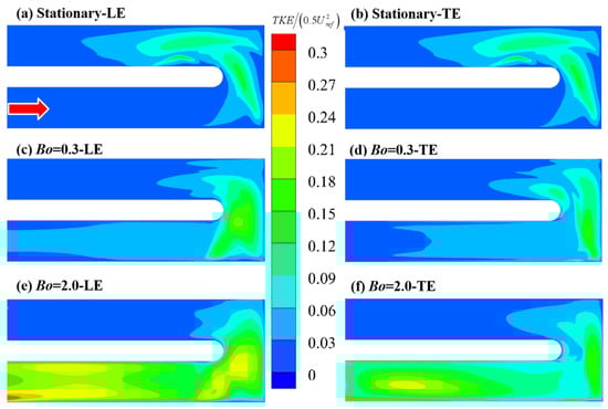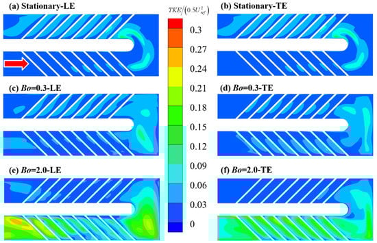 In the rotating smooth channel, the TKE near LE/TE of the first pass elevates at Bo = 0.3 (Figure 10c,d) and when Bo = 2.0 (Figure 10e,f), and the TKE are greatly increased due to flow separation. In the tip turn region of the smooth channel, the TKE also increases due to rotation, especially in the upstream portion. In the second passage, rotation has a negative effect on TKE, possibly relevant to rotation-reduced partial impingement on the sidewall. For the ribbed channel, in the first pass TKE enhancement near LE/TE is very limited at Bo = 0.3 (Figure 11c,d), and when Bo = 2.0 (Figure 11e,f) the TKE is largely increased. In the second passage, rotating also weakens the TKE near LE/TE.