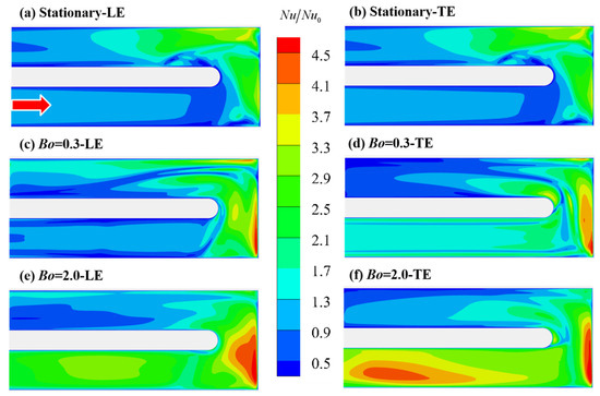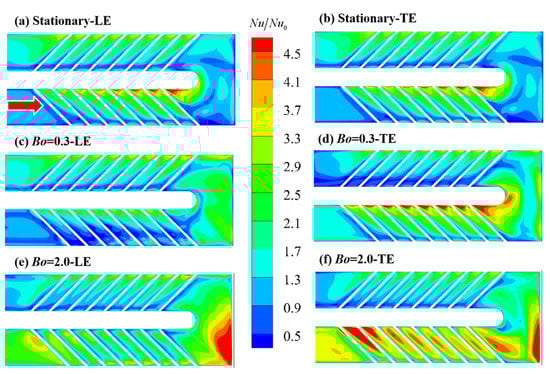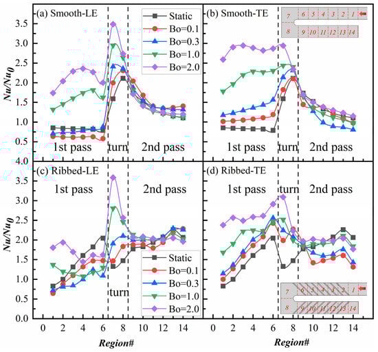 Figure 12 presents the streamwise profile of area-averaged Nu/Nu0 on LE and TE under stationary condition and rotating conditions (Ro = 0.15, Bo = 0.1/0.3/1.0/2.0), and Figure 13 and Figure 14 give the Nu/Nu0 contours. In stationary condition, the Nu/Nu0 of the first passage of the smooth channel is uniformly distributed and close to 1 (Figure 12a,b and Figure 13a,b). In the first passage of the ribbed channel (Figure 12c,d), the heat transfer is greatly enhanced by ribs, and the maximum average Nu/Nu0 is twice that of the smooth channel. Moreover, the average Nu/Nu0 keeps increasing along the passage with continuous disturbance by the ribs and the accumulation of turbulence.