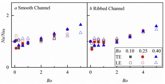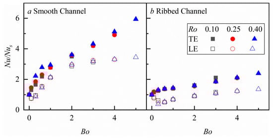 In the first passage of the ribbed channel, the rib-induced heat transfer enhancement gradually reduces as Bo increases. Firstly, when Bo increases from 0.1 to 0.3 (Figure 12c,d), the increased rotating buoyancy fails to enhance the Nu/Nu0 as in the smooth channel. A possible reason is that rotating induces a more significant weakening of rib-induced heat transfer enhancement. In addition, when Bo > 1.0 (Figure 12c,d), the averaged Nu/Nu0 does not keep increasing along the passage as in the stationary condition, but shows an obvious decrease. More importantly, the Nu/Nu0 on LE of the ribbed channel is even lower than that of the smooth channel when Bo > 1.0. The phenomenon can be interpreted as that the ribs are completely covered by the separation flow and the heat transfer enhancement mechanism of ribs induced flow separation-reattachment is greatly suppressed in this region.