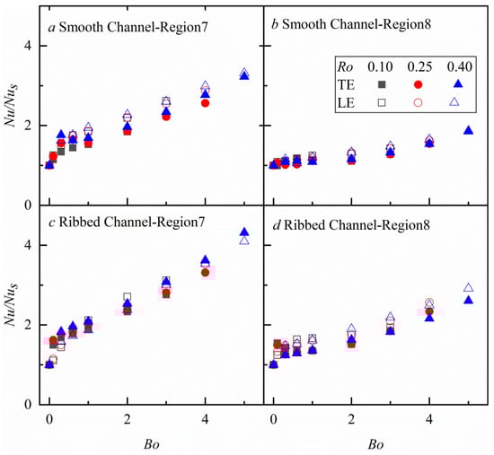 Figure 17 shows the Nu/Nus in the tip turn (regions 7 and 8). Obviously, for both smooth and ribbed channels, on both LE and TE surfaces, Nu/Nus rises with the Bo. Moreover, the heat transfer enhancement in region 7 is more significant. Considering both smooth and ribbed channels, rotation has a larger effect on tip turn heat transfer in the ribbed channel.