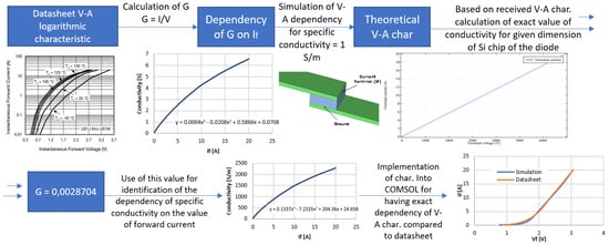 - In the first step, it is important to have VA characteristics (Figure 2a) of specific semiconductor diode (considering thermal dependency). It can be easily extracted from the datasheet of given part. The obtained VA characteristics are then refined to conductivity characteristics (1) that can be seen in Figure 2b.where Ii is i-th sample of the value of current, Ti is the i-th sample of temperature, Gi is the i-th sample of the value of conductivity and V is voltage.