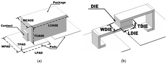 The simulation model domains are easily reconfigurable by geometrical parameters that can be seen in Figure 6. However, for every type of package, a new geometry with parameters that are best suited for its description needs to be designed. With a wide library portfolio of reconfigurable models, it is then possible to simulate the whole electronic system or PCBs thermal performance more flexibly.