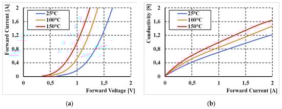 The extracted VA characteristic from the datasheet of US1MHE3 [24] can be seen in Figure 7a, while temperature dependency for 25 (°C), 100 (°C), and 150 (°C) is considered. The Figure 7b corresponds with the temperature dependency of the conductance characteristics of the given diode. The fourth order approximation of conductivity dependency on forward current corresponds to Equation (14).