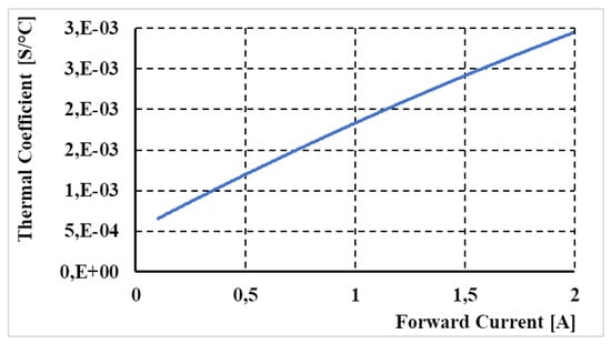 The thermal coefficient is determined for temperature interval from 25 (°C) to 150 (°C) and its dependency can be seen in Figure 8. The fourth order approximation of thermal coefficient “kT” in dependency on forward current corresponds to Equation (15).