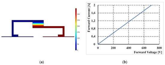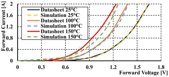 The accuracy of this approach is evaluated by comparison of the simulated volt–ampere characteristic (VA) characteristics with VA characteristics given by the datasheet, while temperature dependency is considered as well (Figure 11). For a given range of diode forward current, we can say that from an electrical point of view, the relative error of the proposed model is less than 1% for 25 °C characteristic, less than 2% for 100 °C characteristic, and less than 5% for 150 °C characteristic.