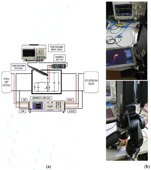 The experimental setup is shown in Figure 12. The diode voltage and current were measured by the current and voltage probe while time-waveforms were visualized on the digital oscilloscope. The input and output voltages and currents were measured with a precise power analyzer, while the individual settings reflected simulation conditions.