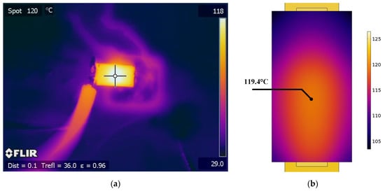 Simultaneously, to verify the electro-thermal behavior of the simulation model, Figure 13b shows the result of the simulation analysis. The evaluation of the temperature at the hot spot of the component shows that the maximum reached during simulation is 119.4 °C. This value is very close to the result, which was reached during measurement, and it is seen that temperature distribution is similar comparing both results. The relative error for this value of current represents −0.5%.