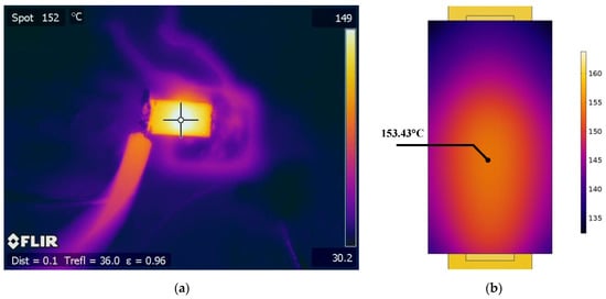 Measurement valid for the second value of the diode´s current is shown in Figure 14, while IF(RMS) = 410 mA. The temperature distribution within the diode package is the same as for the previous situation, while the maximum reached temperature value is 152 °C in the case of measurement (Figure 14a). Simulation analysis was performed at given conditions according to the second measurement, and results are seen in Figure 14b. The hot spot, in this case, reached 153.43 °C, thus representing a relative error during this situation on the level of 0.94%.