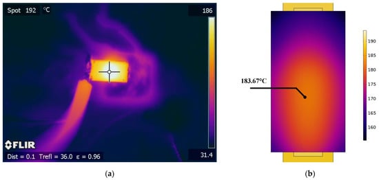 Figure 15a shows thermal distribution during measurement for IF(RMS) = 500 mA. The temperature hot spot reached over 192 °C and this point represents the maximum operational limit considering the temperature of the device. Consequently, a simulation experiment was performed for the last value of forward current. The results are shown in Figure 15b, while it is seen that the hot spot reached a maximum temperature at the value of 183.67 °C. This last comparison represents the highest relative error (−4.3%) from individual experiments. This is closely related to the V-A characteristic at 150 °C shown in Figure 12, where it is seen that the shape of the characteristic between measurement and simulation represents the highest deviation.