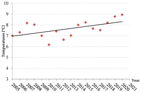 The analysis of the results of changes in the average air temperatures for the Gołdap region from 2005–2021 showed an upward trend, which is illustrated by the linear regression in Figure 4.