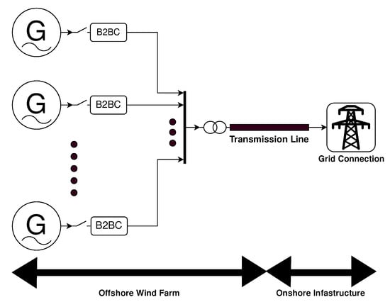 This rapid expansion within the sector leaves an opportunity for the development of new interconnection technology such as the Direct Interconnection Technique (DIT) which is considered in this paper. This technique is a method of integrating renewable generation first proposed by Pican et al., 2011 []. This technique of integration minimises the utilisation of Back to Back Power Converters (B2BC) in offshore turbines by connecting each turbine to a common offshore synchronous bus which can then be transmitted back to shore by High Voltage Alternating Current (HVAC), High Voltage Direct Current (HVDC) or Low-Frequency Alternating Current (LFAC) [,]. The power conversion equipment can be relocated to a single offshore site allowing for better access and optimisation or where transmission constraints permit, relocated entirely onshore.
