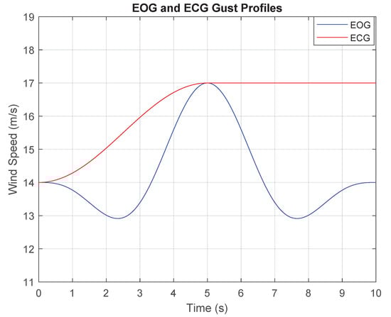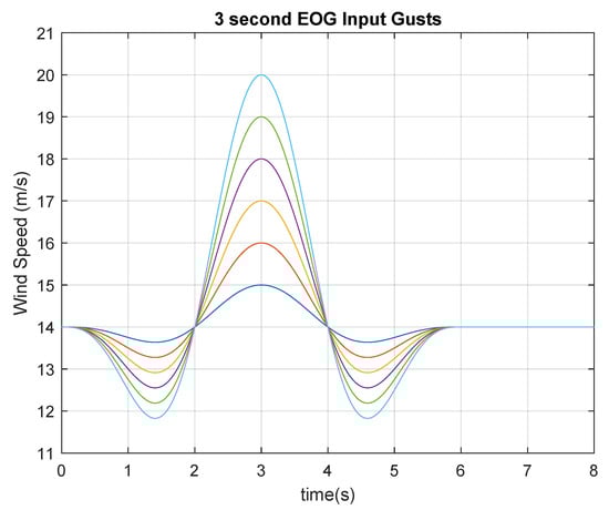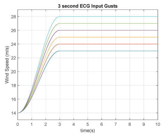 In Equation (2), is the average wind speed, is the magnitude of the coherent gust and T represents the rise time of the gust. Once the gust is complete the wind speed remains at this new value of . A sample of each gust type with the same rise time of five seconds is shown in Figure 3.