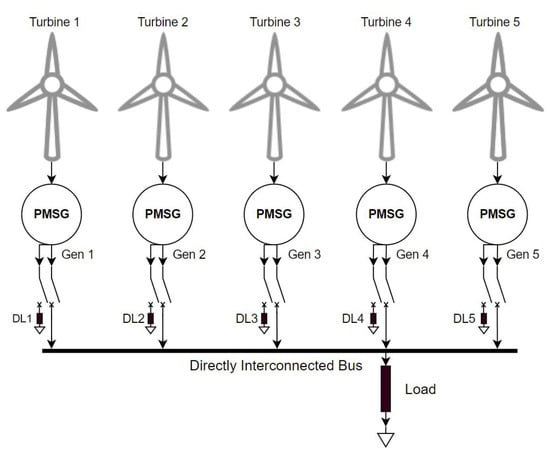 Each turbine utilises a Permanent Magnet Synchronous Generator (PMSG) with a rated power of 800 kVA and is based on a real-world turbine characterisation []. The rated speed was selected at 14 m/s. The simulation begins with all wind turbines interconnected as per the direct interconnection algorithm described in []. Turbine 5 is selected as the pilot generator responsible for the maintenance of the frequency and voltage of the interconnected bus. This turbine in the real world would be selected as a turbine towards the centre of the wind park, thus minimising the risk of this turbine being the first to experience a wind disturbance. Each turbine has its own local dump load for spin up and disconnection from the main bus. A simulation diagram is shown in Figure 4. Disconnection could be required for dispatching down, in line with Transmission System Operator (TSO) instructions [] or during times when the wind speed is outside of cut in and cut out speeds.