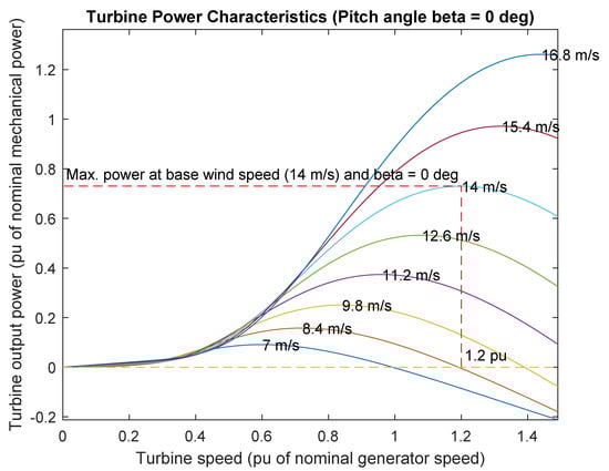 The Wind turbine is modelled using the Matlab Simulink wind turbine model with a nominal mechanical output power of 800 kW and a base wind speed of 14 m/s. The output of this block is applied to the generator shaft in per unit of generator ratings. We assume a direct drive system where mechanical efficiency () is 1. This wind turbine characteristic can be seen in Figure 5.