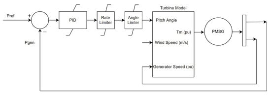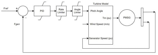 A PID blade pitch angle controller is used with a rate of change limitation of eight degrees per second. This is to account for the fact that pitch angle cannot be varied instantaneously. This rate of change limitation value can be found in the NREL 5 MW reference wind turbine report []. A full control and simulation diagram can be found for both the pilot generator in Figure 6 and for non-pilot generators in Figure 7. For the pilot generator, the control system utilises a frequency setpoint and feedback loop to maintain the farm bus frequency. This pilot generator is set to a chosen power level and excluded from the farm power control loop. Non-pilot generators use a power reference and feedback loop to vary their active power contribution to the bus. The setpoint for these turbines is determined by a farm power level supervisor which takes the current farm power level and set point and distributes individual power levels to the turbines. For further information on the direct interconnection algorithm, see [,,].