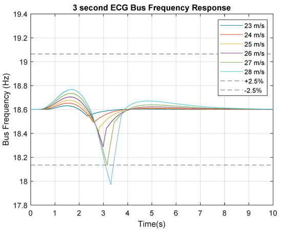 Figure 10 displays the frequency responses of each gust measured at the offshore bus. As can be clearly seen the 28 m/s gust response exceeds the limit of 5% () variation. This is due to the rate of change limitation of pitch angle variation of turbines. With an 8 degree per second maximum rate the pitch control is not capable of maintaining the 5% maximum variation. However, it can be seen that the system can damp the variation and return to steady state in all of the input gust cases. The 27 m/s gust also approaches the negative 2.5% limit but does not exceed it and therefore can be taken to be the maximum boundary limit with regard to our frequency response criteria.