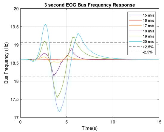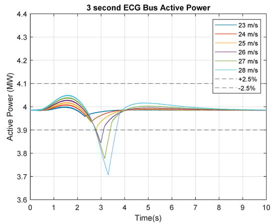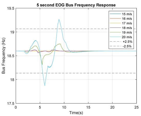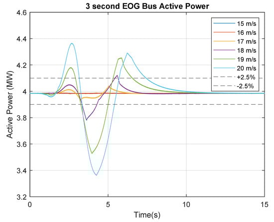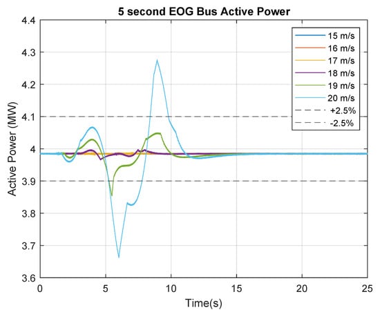 Figure 16 displays the bus active power variation for the 5 s EOG tests. It can be observed that the 19 m/s EOG trace shown in green falls outside the negative 2.5% variation limit for a short period of time. For the purposes of this study, this will be declared outside the tolerance range.