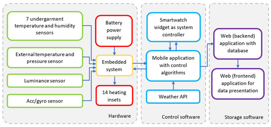 The central point of the solution is the embedded system, consisting of two modules: a microprocessor-based control unit and a power supply module. The control module is based on an ARM Cortex-M4 microprocessor with an integrated radio transceiver. It employs I2C as a communication protocol with all sensors and Bluetooth Low Energy to communicate with the mobile application. The power supply module distributes the energy from the battery pack to the heating insets (using pulse width modulation to control heating levels) and all electronic subsystems. One of the assumptions of the system is for it to have operational reliability; hence, it was decided to use wired connections between the embedded system and sensors.