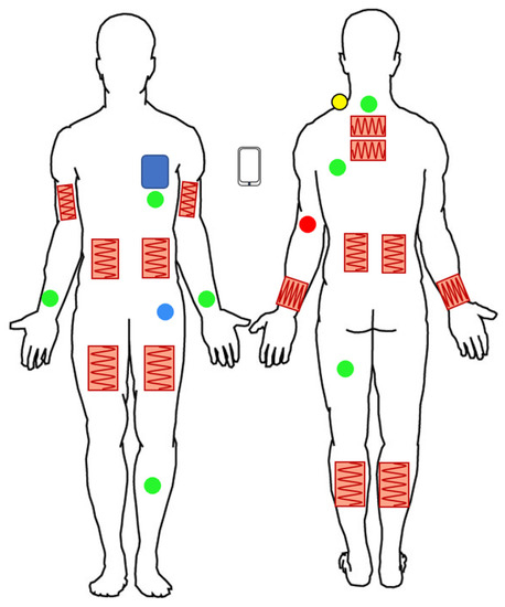 Placement of system components in the suit—left front, right back (red rectangles—heating insets; blue rectangle—embedded system; green circles—undergarment temperature sensors; blue circle—acc/gyro sensor; red circle—external temperature sensor; yellow circle—luminance sensor).
