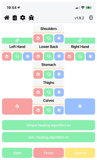 The mobile application has two tasks: to control the heaters in the clothing and to gather and transmit data. A block diagram of the mobile application is presented in Figure 4, and the GUI in Figure 5. The user can manually control the heating insets with the use of dedicated buttons (red- and blue-coloured buttons in Figure 5) or they can activate one of two automatic algorithms (two green buttons in the lower part of the screen in Figure 5). One of the algorithms also uses artificial neural networks to better adjust the performance to the needs of the user. Pressing small green buttons in each body section opens a dialog allowing the user to indicate the comfort level based on a scale of “too cold”, “comfortable” and “too hot”. Each time the user switches the heaters on or off or reports that the temperature of the heater is too low or high, this information is stored in the database.