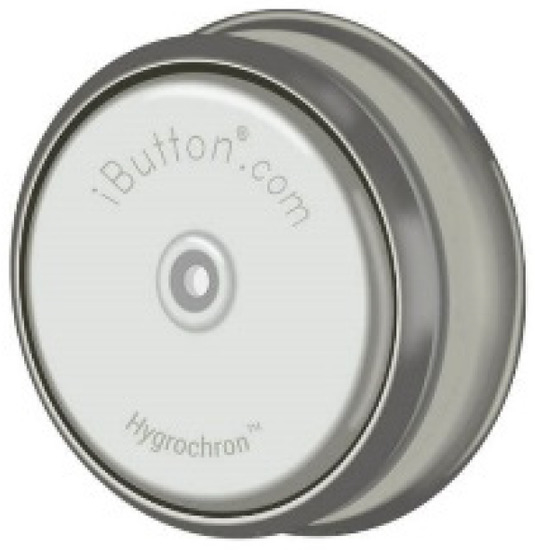 The temperature and humidity during the experiment were recorded using two sets of sensors: the first were the sensors of the thermally active clothing, as described in Section 2.3. The second set, treated as reference, comprised a group of Maxim Integrated iButton sensors (model DS1923, Figure 6) placed in direct contact with the skin, close to the clothing sensors, and affixed using strips of adhesive tape. As they do not support continuous data transmissions, the recorded measurements had to be read after the conclusion of the experiment. Furthermore, the obtained data had to be synchronised with the clothing sensors using timestamps recorded by both sets of sensors—for this purpose a dedicated Matlab script was written. At first, the signals were resampled by the retime function using linear interpolation with 0.25 s step. Then, the synchronise method was used to aggregate data from all input timetables and adjust them to common time vector.