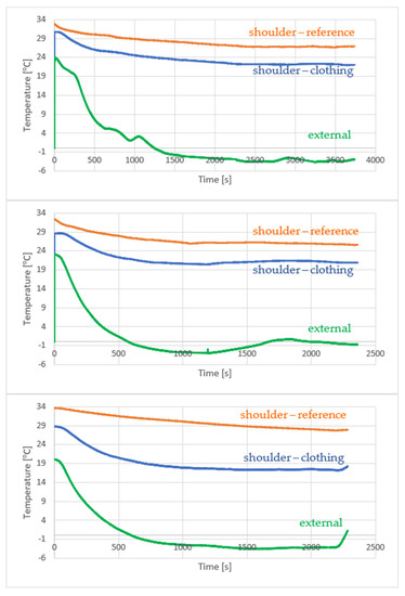 Temperature sensor readings: shoulder—reference (orange), shoulder—clothing (blue) and external (green) temperatures. From top: participants A, B and C. Note the different duration for participant A. The sudden rise of the external temperature reading for participant C at 2200 s is caused by leaving the chamber.