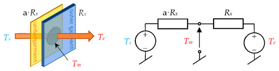 In order to circumvent this problem, a thermal resistance model has been proposed (Figure 8). Skin temperature (Ts) can be computed from the clothing sensor and external sensor temperatures (Tm and Te) according to Equation (2). The value of Rx can be eliminated from the equation, as only the ratio of two thermal resistances is of importance (an example of a thermal divider). The parameter a can be computed by requiring the computed and measured (by the reference sensor) skin temperatures to be equal. Before actual computations, it is necessary to account for another problem, as discussed in the next section.