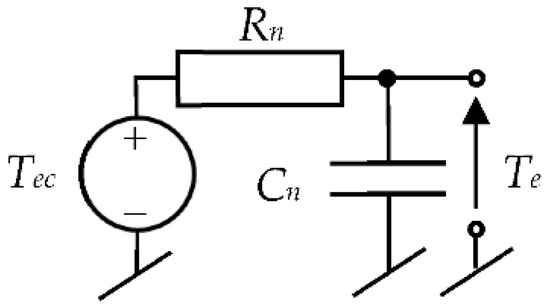 The authors attempted to simulate thermal behaviour of the sensor using a single time constant model, as presented in Figure 9. The dependency between the true temperature, Tec, and the measured temperature, Te, is given by the time constant RC, as in Equation (3). By setting the expected external temperature (scaled Heaviside step) to the input and adjusting the value of RC so that the computed output follows the observed measurements for participant B, the optimisation procedure arrives at RC = 250 s. The mean error per sample for the first 18 min is 0.27 °C, which is a satisfactory result.